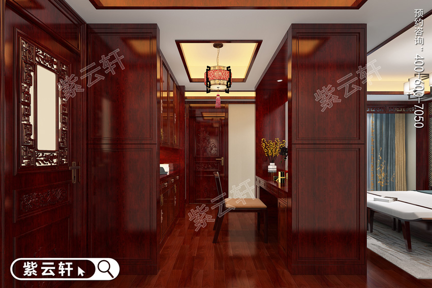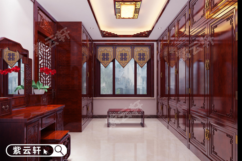 在中式家装中,为了保证整体风格的和谐统一,我们在设计衣帽间时也会选择古典风格。目前,主流衣帽间主要有三种类型:开放式、独立式和嵌入式。无论什么样的装饰风格,都离不开红木衣柜。大红酸枝的衣柜似乎将鸟语花香回归到了房间里。