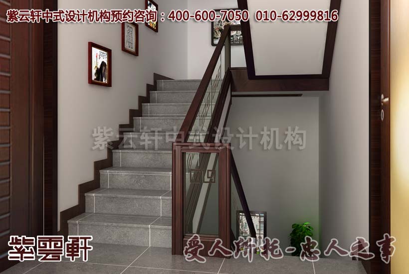 楼梯台阶采用青灰色调,宁静而不张扬,轻声漫步过回廊,沉稳大方。拾阶而上,如翱翔云端,身边尽然是脱离尘俗的雅韵之气,古朴色的青砖台阶与木质扶手相互辉映十分协调,显示出一种严谨整齐的格局,映现出主人一丝不苟的风格。