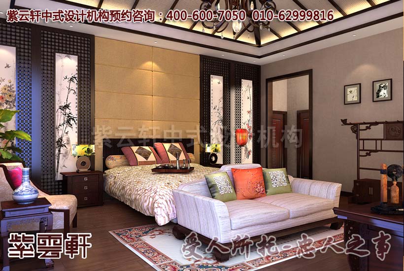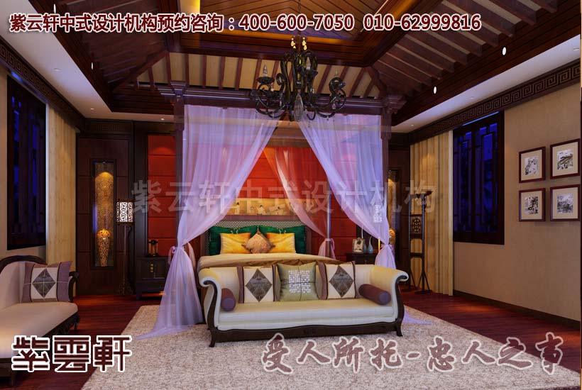 女儿房的别致给人以未出阁女孩儿的温婉,而主卧则主要强调的是温柔乡的浪漫和温馨。舒适的贵妃躺椅,可卧式沙发,温暖厚重的白色地毯,极尽豪华。紫纱帐掩饰不住原木大床透露出来的浪漫,反而增加了整个格局的韵味,相互对望的两个古窗以及落地窗帘,还有立于床边的衣架,无处不在向外宣示浓浓的情意,而又以藻井为吊顶,要求夫妻做到平平稳稳,意在相扶相持,恩爱和谐。
