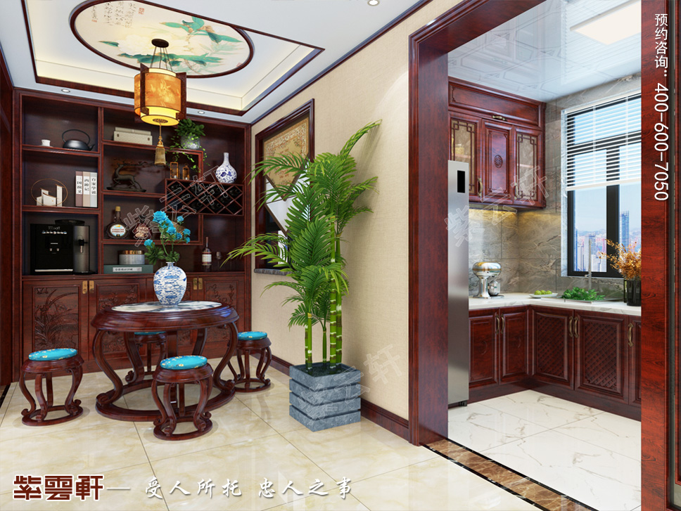 餐厅中式装修,透过月亮门看去,红木餐桌古典古香,搭配着多幅鲜艳的古画,每一装饰都增添了无穷的闲情雅致的乐趣。
