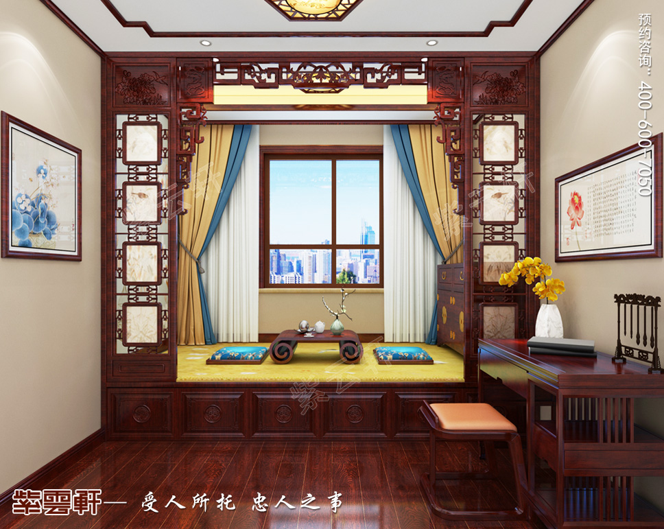 暖阁中式装修,整个空间都散发着花的芬芳,静坐在窗台,望远方景色,捧一本书,盏一杯茶,心如潮水,静而不平。