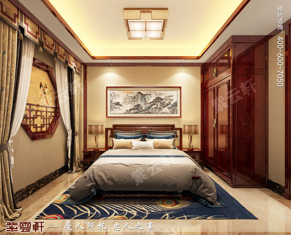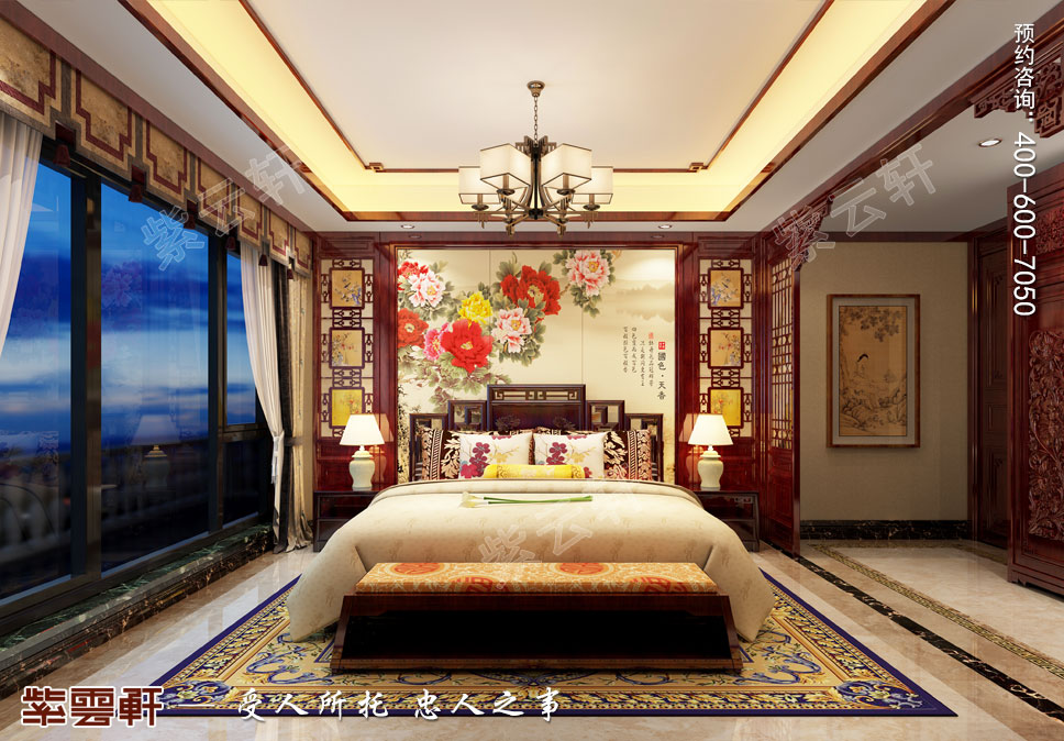 主卧中式装修案例,背景墙的牡丹图,彰显出主人的不凡气质,蓝黄相间的花纹地毯甚是典雅,衣柜旁边的墙上有一幅人物图给人以清新淡雅之感。