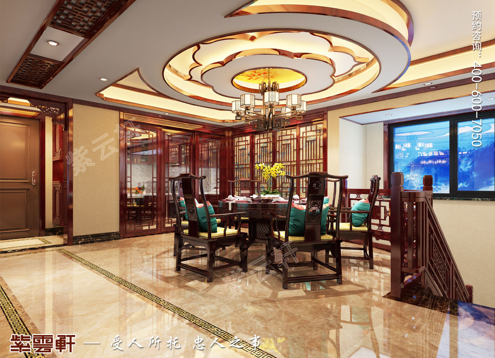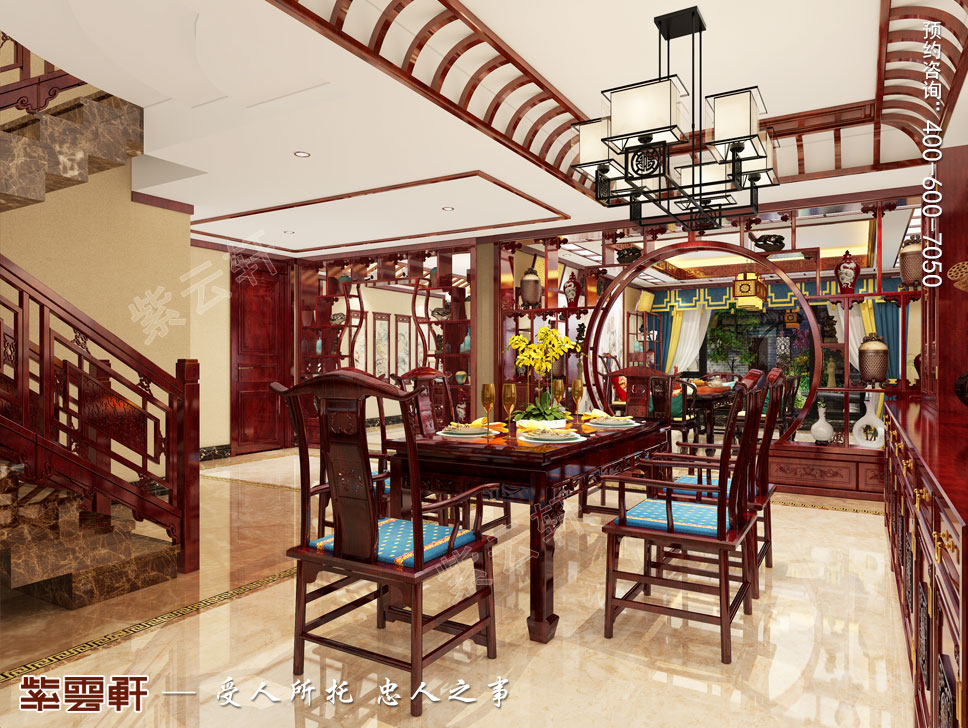 餐厅中式装修案例,红木的桌椅彰显沉稳大气,餐桌上方的藻井缀着华丽的宫灯。