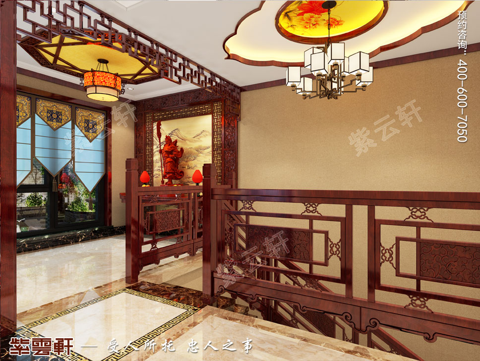 走廊处,楼梯两侧采用镂空花纹,别具典雅,头顶上方优雅的宫灯投射下来的暖色灯光给人和煦温暖。