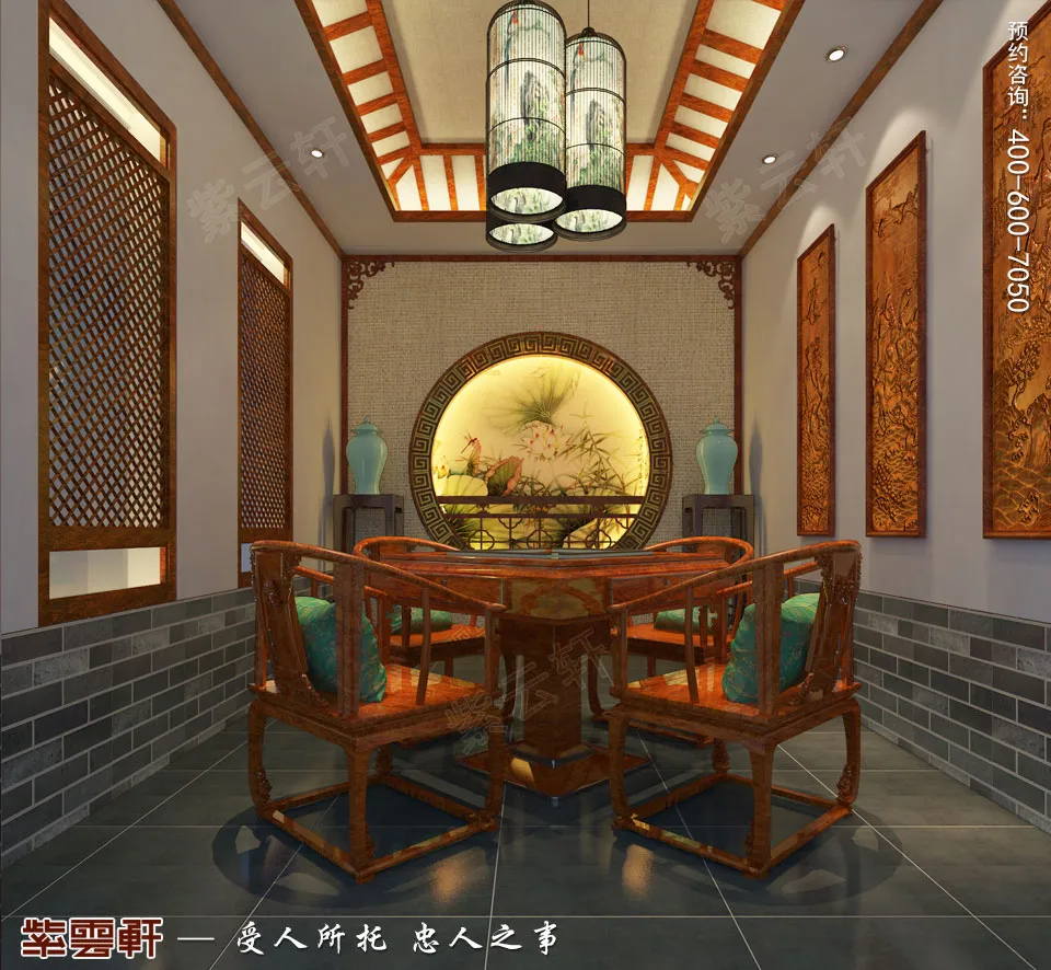 不需刻意营造,就有一种典雅别致、宁静致远的娱乐气氛,色泽靓丽红木家具、雕刻精巧花鸟图文与古朴简约的红窗格栅温婉优雅静静伫立,这里有清风自来的淡泊、有返璞归真的绝俗、也有身心寂静的归宿!