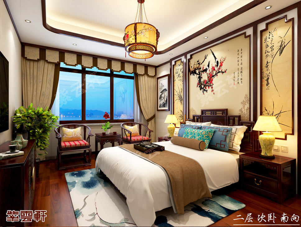 二层主卧中式装修,气韵雅致,细说其一种就有千言万语,拐子纹罗汉床,线条横竖分明的回纹与弯曲翻转的卷草纹美妙的结合在一起,形成刚柔并济的图案纹饰,优美华丽,经典大方!