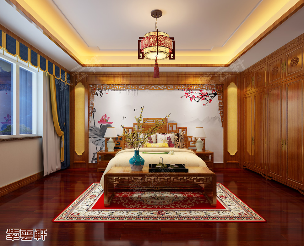 主卧室色调温情明朗,简约的民族地毯,电视墙的装饰画颇有怪趣,两盏暖暖的台灯也像是在守护着这个温馨的家!