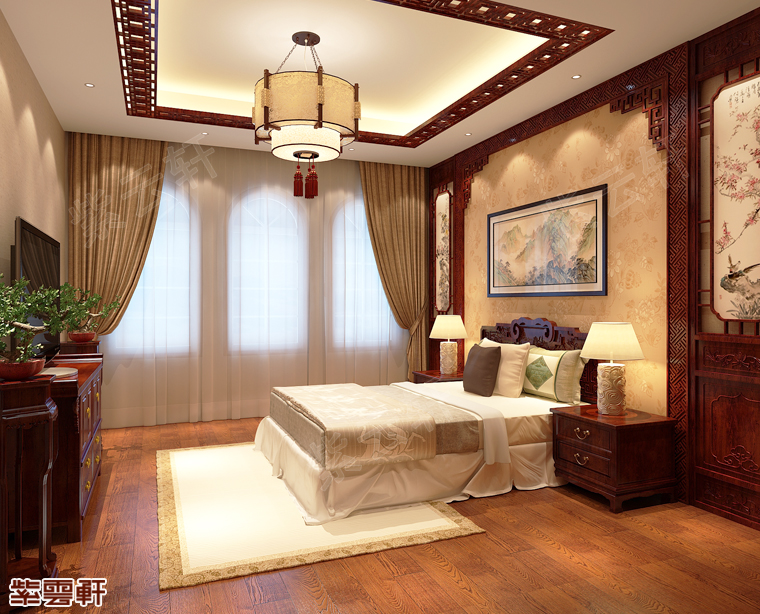 卧室,床头梅兰竹菊的装饰有品格高尚的寓意,床头家具也十分简约质朴,员工向的窗户造型别具一格。墙沿的彩绘装饰显露出了中式装修的传统文化,棋盘状的吊顶更添文雅气质,雕梁画栋间流露出中式雅韵。