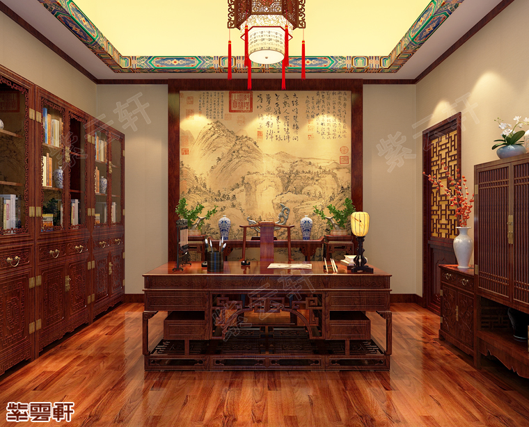 书房,一套书房家具组合质朴内敛,写字台上的文房四宝更添书卷气息,后面的水墨背景画上描绘了一幅群山图,延绵宏伟。一侧的回锦文地四君子书柜中摆着琳琅满目的古典书籍,显露出了书房主人勤奋好学的特点。