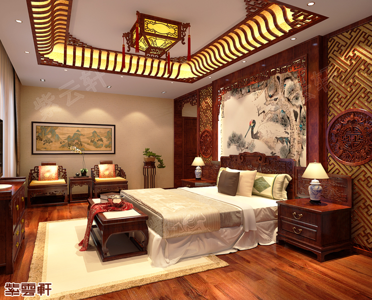 老人房,床头装饰古典稳重,镂空的保护墙上嵌有一扇圆形雕花月洞,十分古香古色。背景画上绘有松鹤图,有延年益寿的象征。一侧的墙边摆放着一套组合桌椅,用作休闲区,上方噶这的景观图精致又典雅。