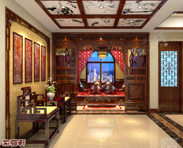 暖阁,铺着红色锦文的坐具上华贵典雅,精巧的宫灯缓缓缀下,衬得坐具周边美轮美奂坐具与休息活动区用雕花门楣隔开。卷纹组合桌椅用作休闲区小憩,墙上的四幅木雕梅兰竹菊图十分精巧雅致,吊顶上水墨设计也很是引人夺目。