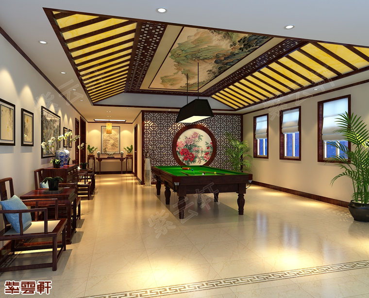 娱乐室,活动空间宽敞,正中间位置摆放着一张台球桌,适合闲暇之余活动放松,后面背景处的镂空保护墙上镶着一扇彩绘月洞,上满描绘着一簇簇娇艳的牡丹,十分灵动自然。