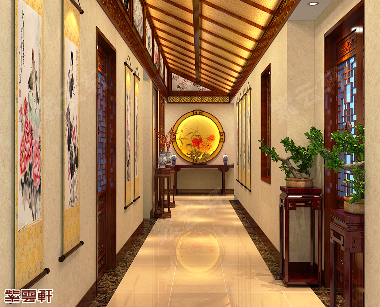 走廊,墙面上都挂着古典文艺的彩绘作品。