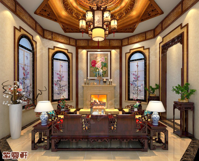 客厅,环形墙体设计在视觉上更加立体,拱形的窗子上绘有一簇梅花暗香疏影,好不雅致。正中间有一处壁炉,上方的牡丹图雍容华贵十分光彩夺目。吊顶上造型独特的藻井富丽典雅,从中缀下来的红色流苏宫灯都华丽温婉。