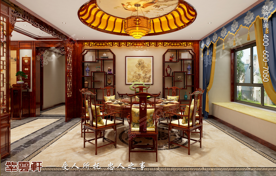 餐厅沿袭古人天方地圆的概念,无论是圆形吊顶还是方形地砖,每一个元素都能让人一眼看出传统文化的应用和体现。