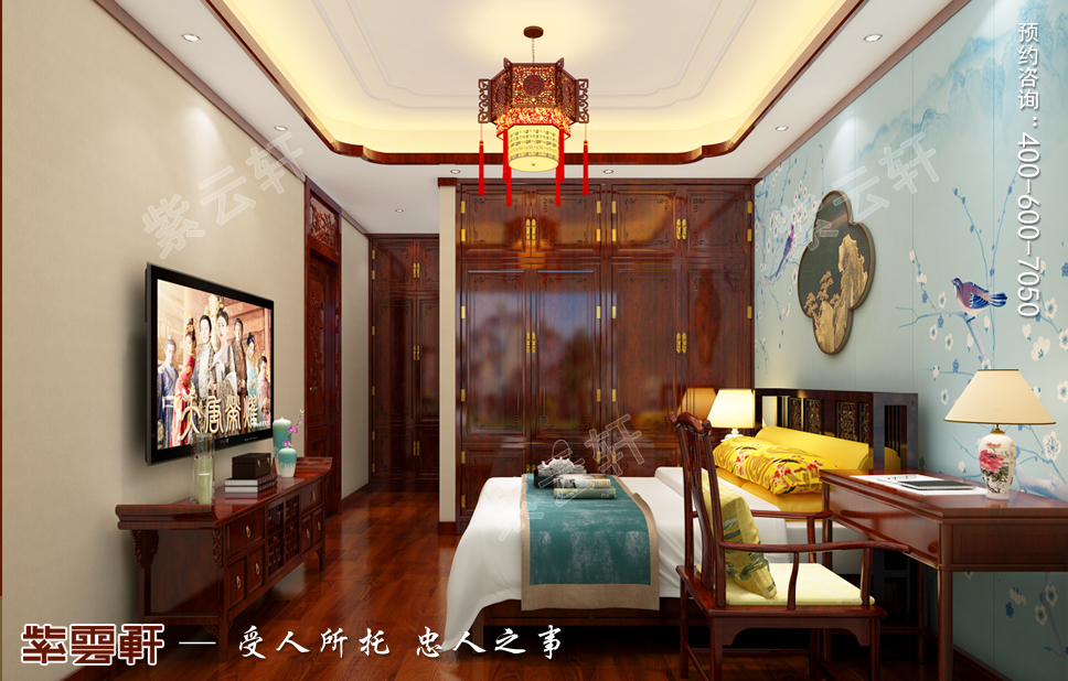 次卧,素面裹圆顶箱柜依墙而立节省空间,搭配蓝色花鸟背景墙更显诗情画意。