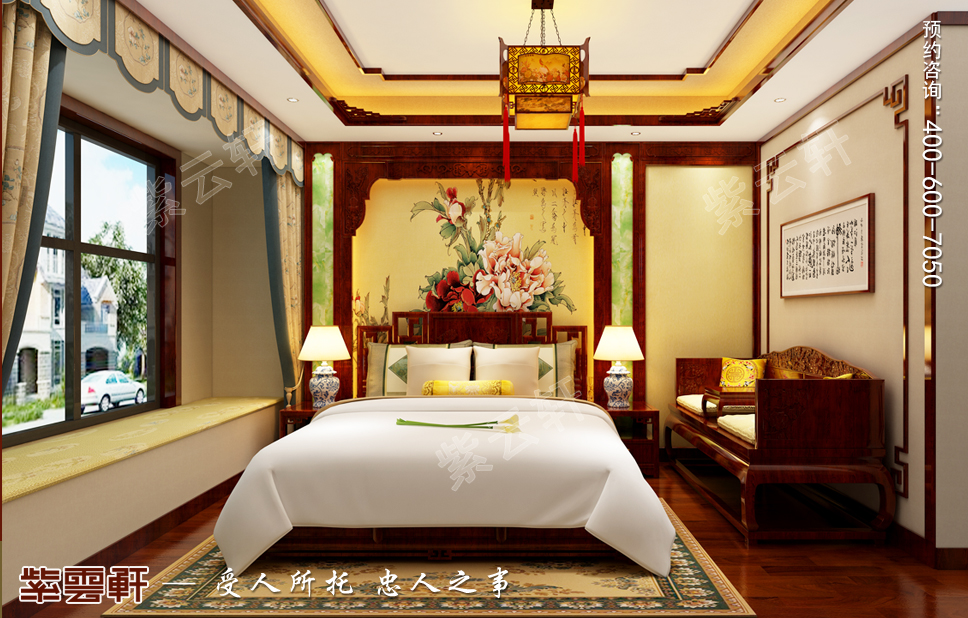 主卧凸出自然和谐的中式意境,简单的空间加以两幅书画点缀出高雅的修养,暖色的宫灯装饰,给人一种温馨柔和的感觉。
