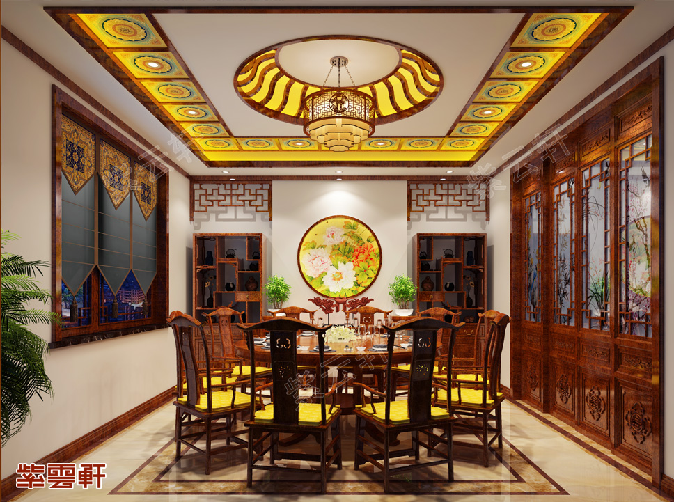 推开餐厅的大门,眼前展开的是一个风格奢华的空间,天花板上华丽的仿古吊灯,每个角度都折射出柔和温馨的光芒,黄色配色点缀出富贵华丽的气质,四出头官帽椅质地密实,精妙雕工尽显中式之美,两个多宝阁可以提供收纳功能,中间一幅圆形花卉图做点缀,两旁花瓶里的绿植散发着自然的生机,与周围古典装饰搭配得十分和谐。
