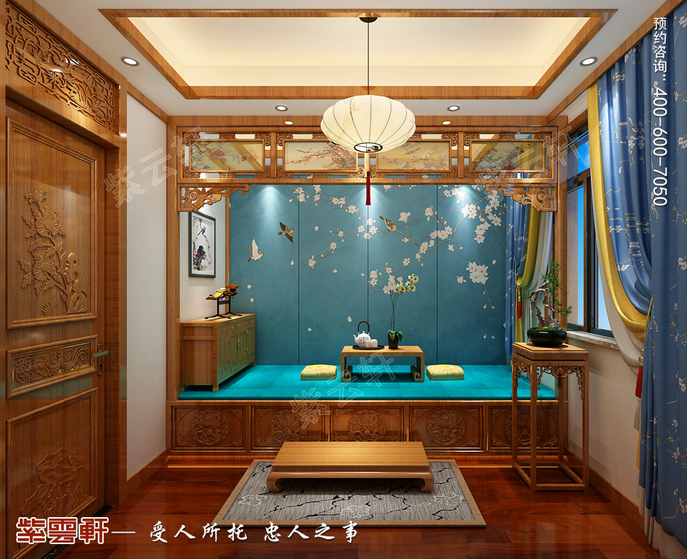 暖阁温馨舒适,清新的配色又不至于呆板,全木质的地板,仿古式吊灯,家具上雕刻着精致的花纹,浪漫与庄严的气质,经典又不落俗套,平实而精致的榻榻米自成一片小天地,一个让人感受平静的空间让人心向神往。