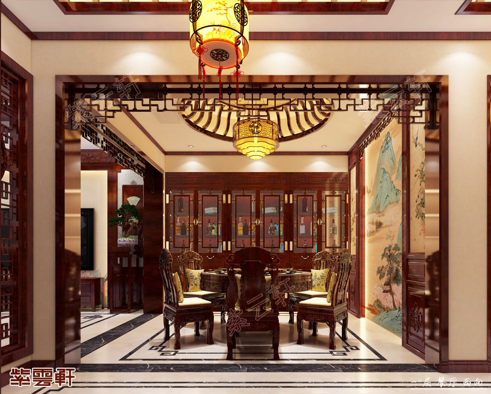 餐厅的设计非常豪华,餐厅空间紧挨着客厅空间,墙面选用大幅古典国画作为装饰,豪华的原木餐桌矗立在这个空间里,稳重大气的酒柜嵌入于墙边。每当周末休息日,这个空间就成为娱乐就餐的开心领域,全家人享受温馨愉悦的就餐环境。这也就是装修别墅选择中式的主要原因吧。