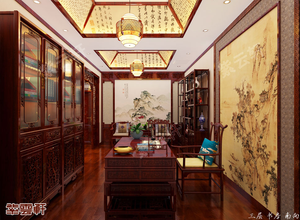 书房,要论最能体现出中式装修精髓的,那当以书房莫属。作为家中气质养成之所,无论哪一隅角落,无不透露出骨子里的东方风雅。平整豪迈的山川画墙面与精雕细刻的书柜,简对繁,棕对红,雕梁画栋,诗意满满。无论读书还是思考,这间书房都是一个陶冶灵魂的绝佳之地,散发着一种温婉和谐、古趣盎然的意境。