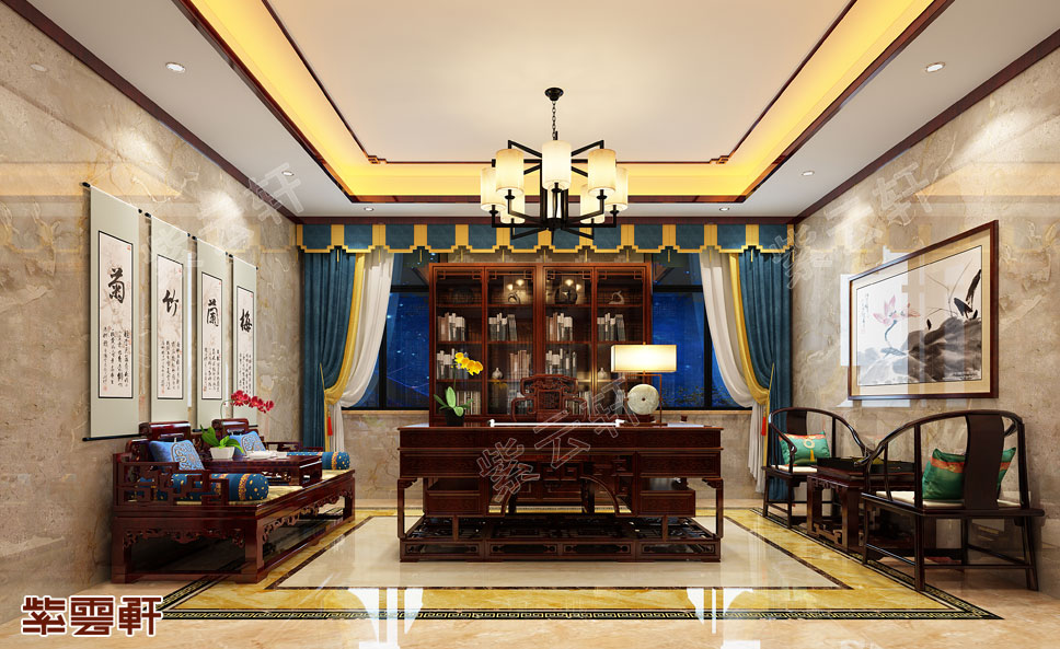 书房,房间中布置了沙发座椅,这间书房不但可以作读书办公之用还是会客待友的好地方。两侧墙边上分别挂着充满古意的书画,中心则是方正的书桌、书橱,给人一种稳重、厚实的踏实感,而这种感觉只有中式装修才能完美的体现出来。