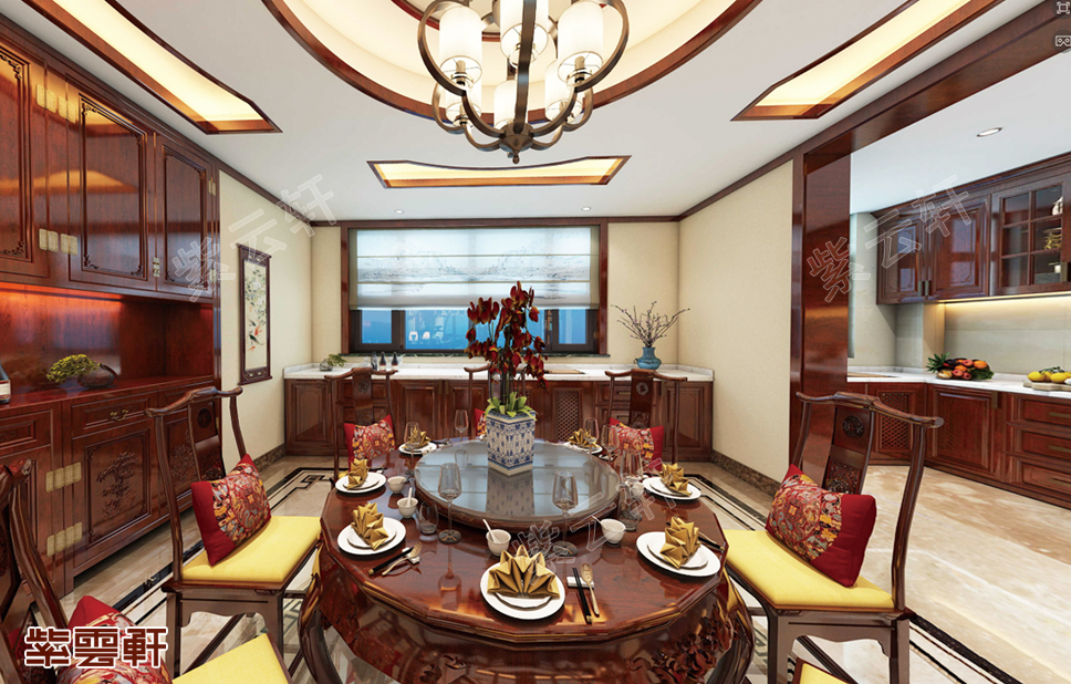 餐厅,红木餐桌官帽椅材质细腻、造型端庄,结合墙面文雅诗意的挂画,显得儒雅而厚重。嵌入式的橱柜,特别实用,储物空间非常强大,通过顶灯的光照,特别漂亮。黄色的坐垫为空间添加了一份明亮,中式装修使得整体色彩饱和灵动,非常耐看。