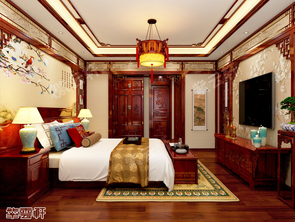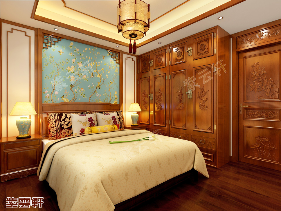 卧室,床头墙是以花枝图案为背景墙的硬包设计,非常有文艺范。红木橱柜不但材质温润美观,其雕花纹路亦是难得一见的艺术品。床头墙上摆着精致的床头灯,少量的绿植点缀给卧室增添了自然感,整体空间选择中式风格端庄优雅而高级,散发着浓郁的古风。
