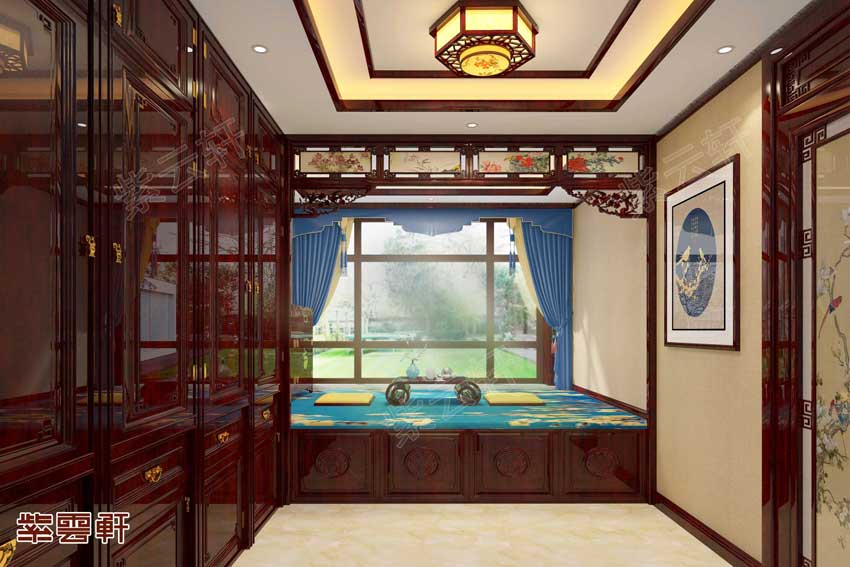 暖阁,整体红木装饰榻榻米上摆放着一方案几,既起到了装饰装饰作用,又有美观雅致的效果,宽大通透的玻璃窗将窗外景色映射到窗上,敦厚质朴的红木衣柜更显古典装中式家装设计的不凡品质。