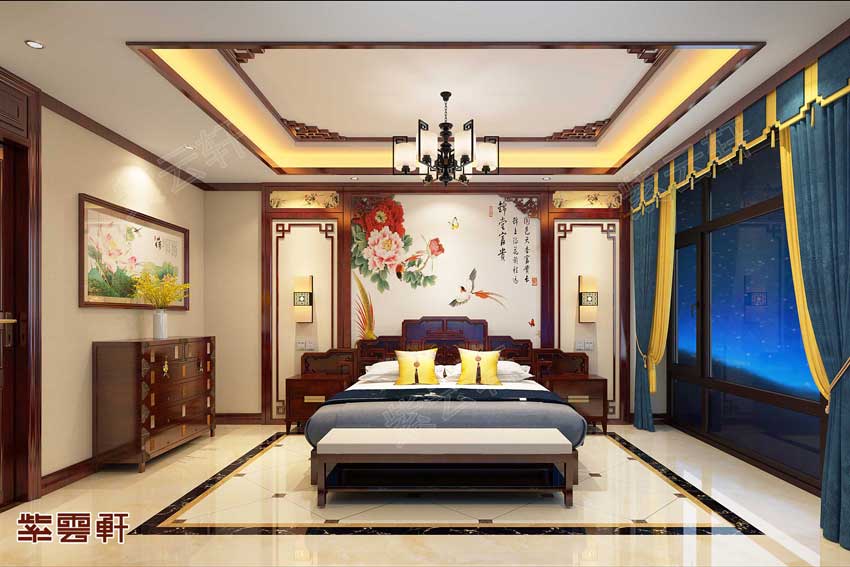 主卧,宽创的空间使人有种畅意之感,围板檀雕大床素雅端庄,床头背景上描绘了一幅牡丹图,颇显国色天香之华美,墙上镶着的传统中式水墨画更显其雍容富丽之感,一饰一物都将古典中式装修的特立独行展现的淋漓尽致。