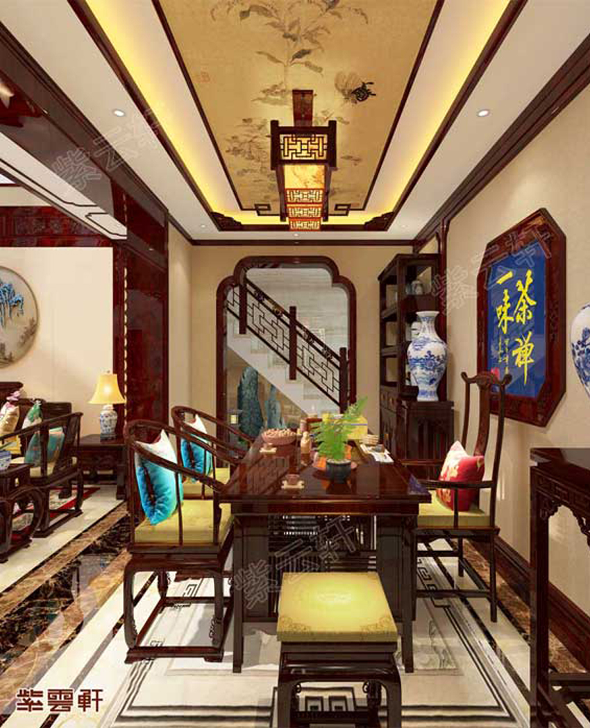 古典别墅装修设计中最主要的元素就是红木,红木家具在现代风格的布置中更显得华贵不俗,在装饰布局是主要元素。