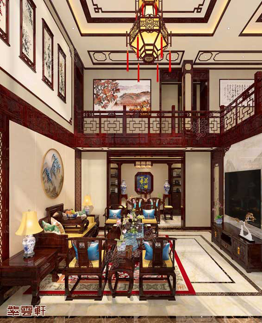 客厅,复式挑高设计使空间延展性更加良好,组合红木家具尽显端庄雅致之感,搭配颜色鲜亮的靠枕装饰更加亮丽,沙发背景处嵌着一幅传统水墨画作壮美辽阔,十分磅礴,藻井处垂下的流苏宫灯温婉华丽,一装一饰间流露出古典中式的多面之美。