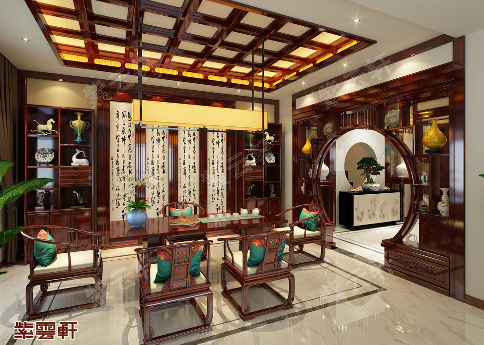 茶室中式设计,堪称经典中式室内设计实例,穿过多宝阁月亮门,入眼处便是环境清雅幽静的茶室空间,圆圈椅组合经典复古,行坐此间,品茶香,论诗书,悠哉快哉。传统典雅的背景墙上书法点缀颇有气质,一装一饰犹如高门显贵之家装修风格。