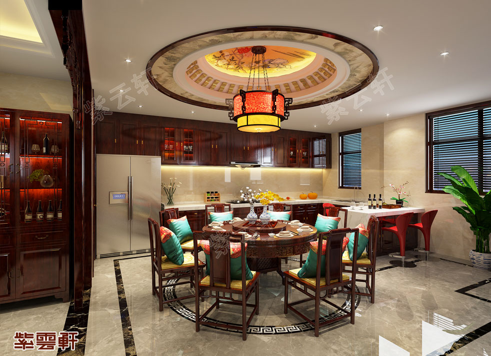 餐厅,正中央位置的官帽椅素面组合,将中式端庄雅致的风格烘托到极致,华丽的藻井处镶缀着一盏典雅温婉的宫灯,彰显高贵之感,厨房与餐厅相连节省空间,简约现代的吧台十分恰到好处。