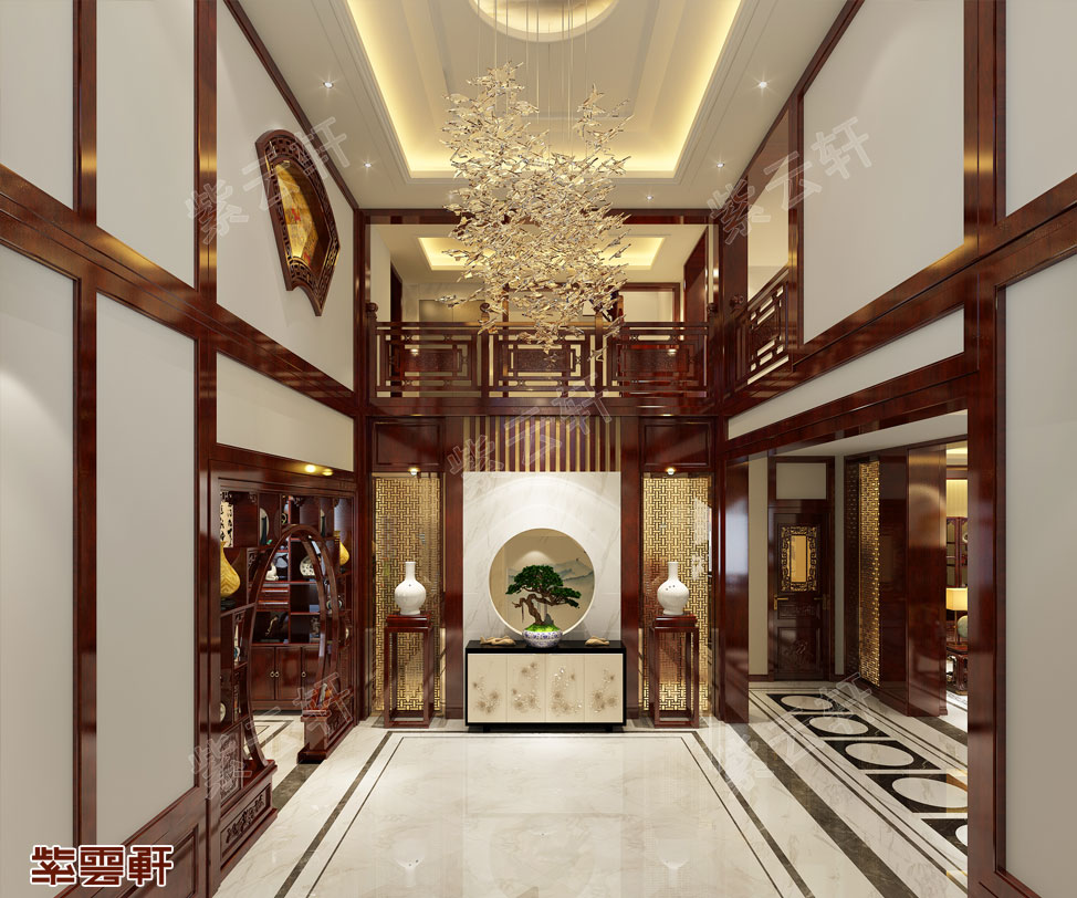 门厅,复式挑高设计极具空间延展性,背景处摆放的盆栽装饰与把背景墙融为一体,极赋中式美感。