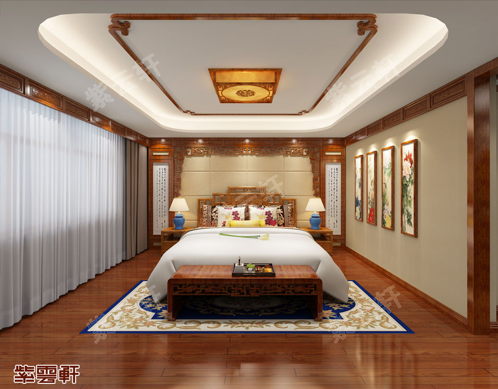男主卧,简约古典的装饰风格,复古檀雕大床十分精致,床头背景简约清雅,蓝色刺绣地毯展现华美之感,极赋中式家具风格,一装一饰间彰显传统中式装修的特色,现代极简新中式,抓住你的胃。