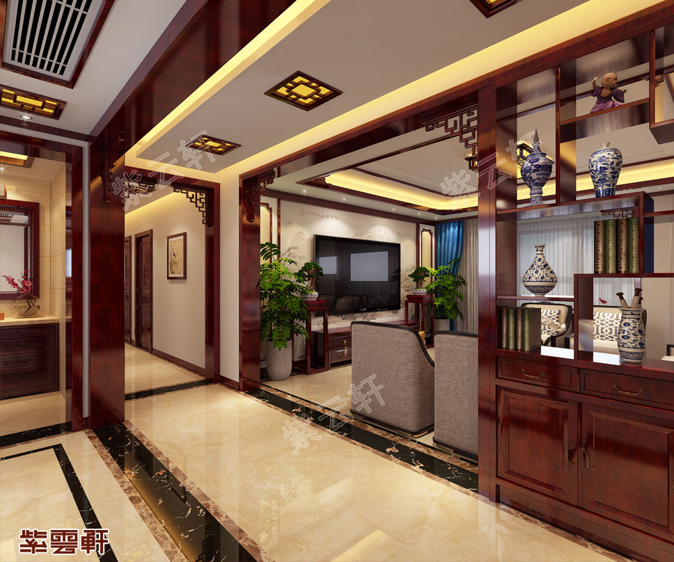 门廊一览,中式入门玄关效果图,笔直悠长的走廊,装满琳琅珍宝的多宝阁,意蕴悠远。