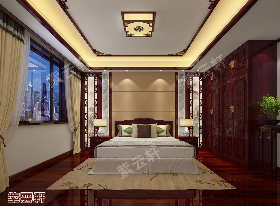 主卧,馥雅清静的环境氛围使房间更添静雅,充满古典意蕴的气质,令人心生神往志强,复古典雅的木雕装饰起到了画龙点睛之感,宛若旧时富贵人家闺阁内宅的华贵婉约。