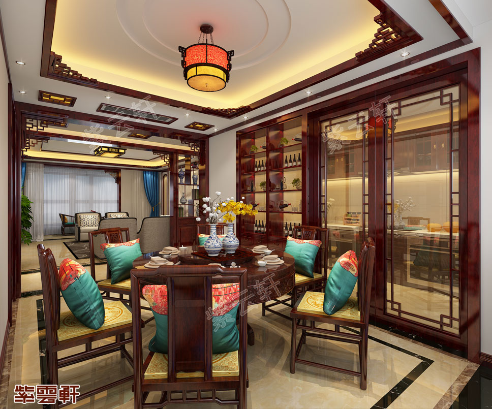 餐厅,开放式空间十分开阔,南官帽灯挂餐画作组合静雅端庄,插花装饰点缀其中很是应景,酒柜中摆放着各色名酒,像极了勋贵人家会客餐厅。