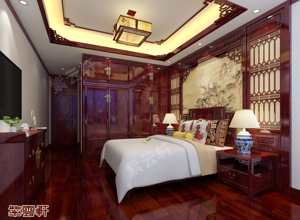老人房,简约清婉的风格装饰,犹如古典家居环境氛围具,将传统中式装修的婉约大气展现的惟妙惟肖,再配上精美时尚的别墅家具,经典巧妙的木雕别具一格,整体空间充满古典余韵。