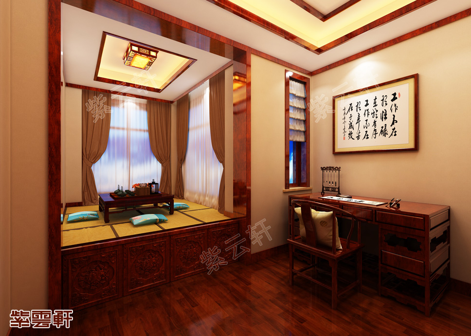 书房,温馨素雅的房间中放置了一张质朴简约的榻榻米,显得雅致温良,一侧的尊说卓方便学习练字,一幅书法题字的装饰点缀房间,整体上颇有书香世家清流雅致之风。