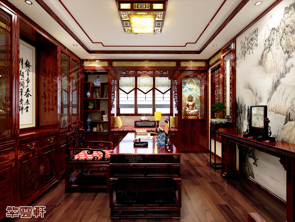 书房,环境氛围犹如误入了哪家文人书房般古香古色,书香气质无不风雅古韵,一侧的休息区设计了一张榻榻米,闲暇之余方便小憩,雕花书柜中摆放着各色典藏书籍尽心博学。