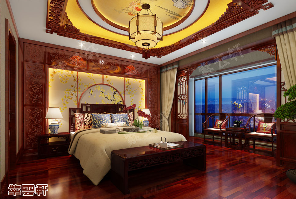 卧室,空间明朗华贵的气质十分出尘,古典清隽的传统木雕床给人一种温馨惬意之感,床头古典华美的装饰点缀十分光彩夺目,整体空间中弥漫着一种自然华贵之感。家庭装修设计中的卧室在选择中式风格时更多的会关注门窗,做成方格或者其它传统中式图案,用实木雕刻成各种造型,打磨光滑,更有立体感。