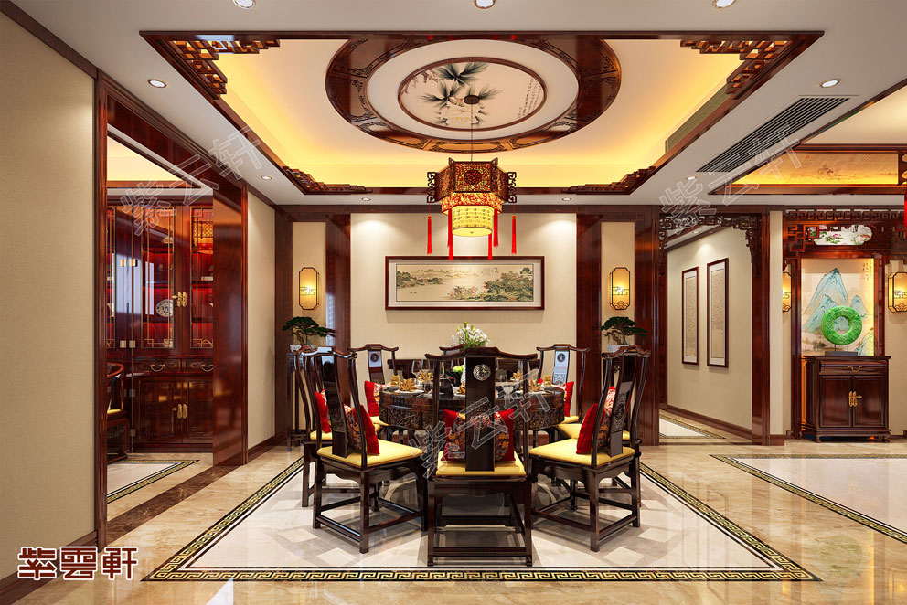 餐厅,开放式空间在视野上更加开阔,官帽椅组合彰显其简雅风尚,藻井处镶缀着的流苏宫尽显其华美婉约,宛如宫廷内院中所用的灯饰,周边装饰无不尽显其风韵繁华。中式家装设计的餐厅更加偏向于复古风格,这是东方精神的骨架,在传统设计的基础上展现都市人的儒家风范,当然主要还是体现在传统装饰上。