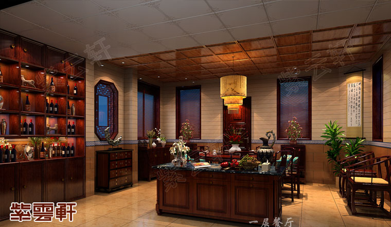 餐厅,厨房与餐厅结合便捷又充满古典意蕴,组合桌椅与敦厚酒柜交相辉映,暖色调灯光投射出十分温馨的光彩。从红酒的珍藏上来看,主人也是一个爱客的人,除了美味的菜肴外,在典雅大气、清新脱俗的中式风格餐厅里用餐,也是一种享受。