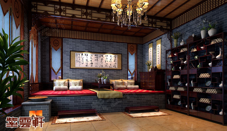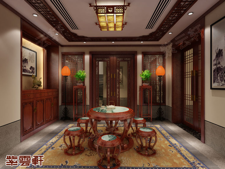 茶室,一进入茶室仿佛清香气味立刻萦绕在身旁,组合彩绘桌椅十分清雅,简约的装饰环境营造出一种婉约恬静,品上一捧茗香,简直是最畅快地事情。门的两侧放着玲珑可爱的金黄色酷似宫灯的小灯笼,还有点像祈福的天灯,定能给我们带来好运气。住宅装修中,我们可以根据自己的喜爱放一些有代表意义的中式装饰,让整个空间充满色彩。