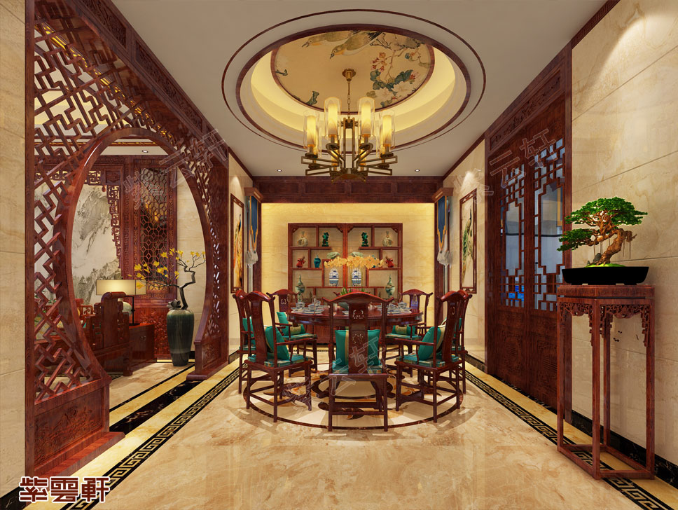 餐厅,气质庄重的多宝阁,加入瓷器玉器等软装细节装饰,营造出一种自然舒适的氛围感。红木餐桌复古的造型特别有中式味道,圆桌寓意团圆和美,又符合“周而复始,生生不息”的中国古代哲学精神,在餐厅中最常见。加之原木装饰的吊顶设计,中式装修设计的意境和韵味完美的体现出来。
