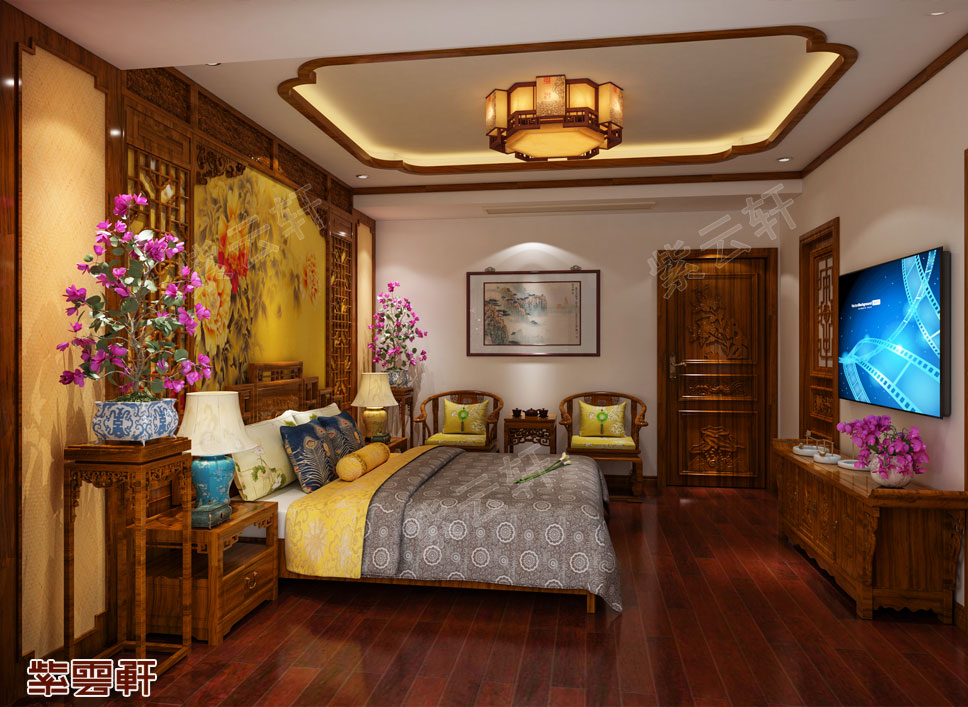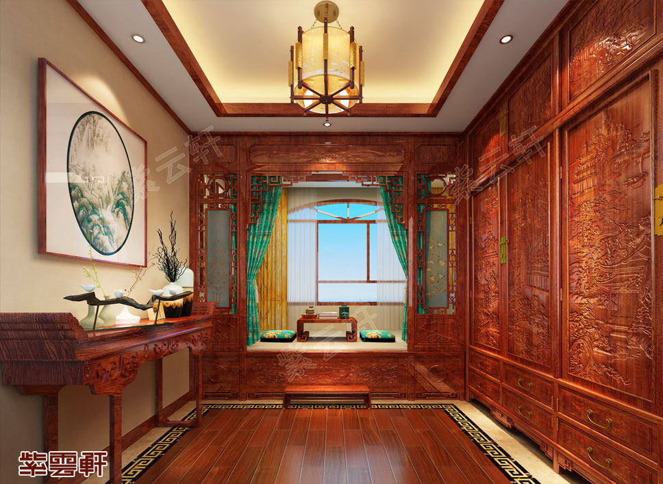 卧室,一侧选用组合衣柜,而选材多为黄花梨、紫檀、红木等珍贵的硬木,装饰华丽,在柜门上通过浮雕和镶嵌代表着不同的寓意。另一侧放置条案,可用来放置一些装饰品,整个卧室给人一种豪华大气之感。