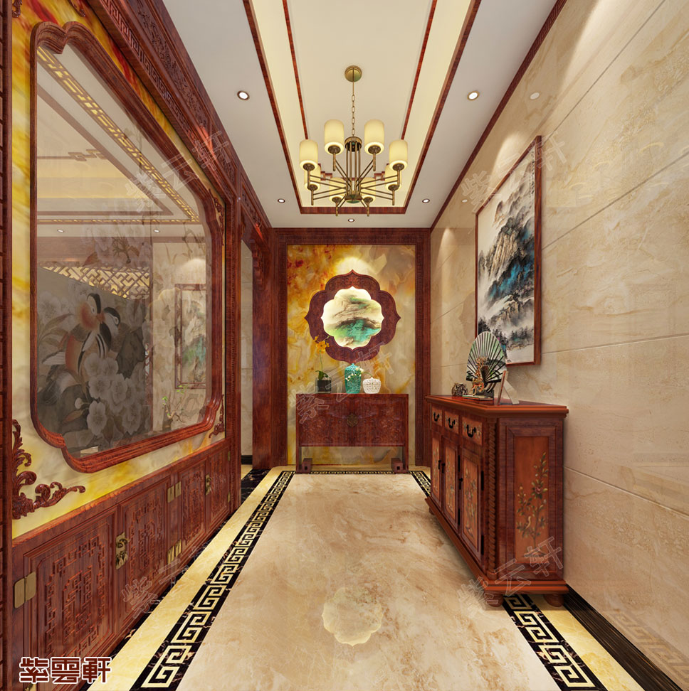 玄关,开阔的空间尽显豪气阔绰,红木装饰的镜子墙优雅大气,舒适实用又极具传统之美。装饰墙面的书画非常文雅,搭配下方的红木橱柜简洁又不失古意,还有非常好的收纳功能。中式装修玄关的色调宜淡雅,而且要整洁清爽,一进门就要给人一种想要进去的冲动。