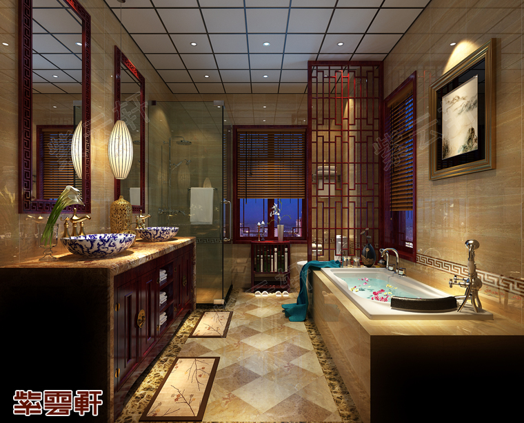 卫浴室,中式家具与饰品颜色较深,传统中式讲究的是“原汁原味”和自然协调的搭配,更能展现古典家具的内涵。